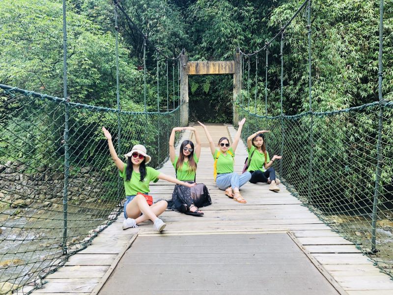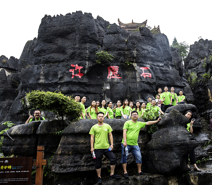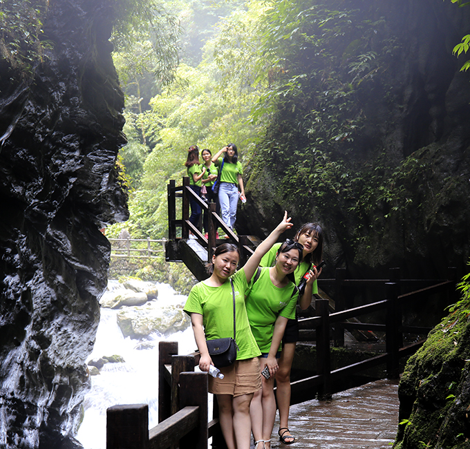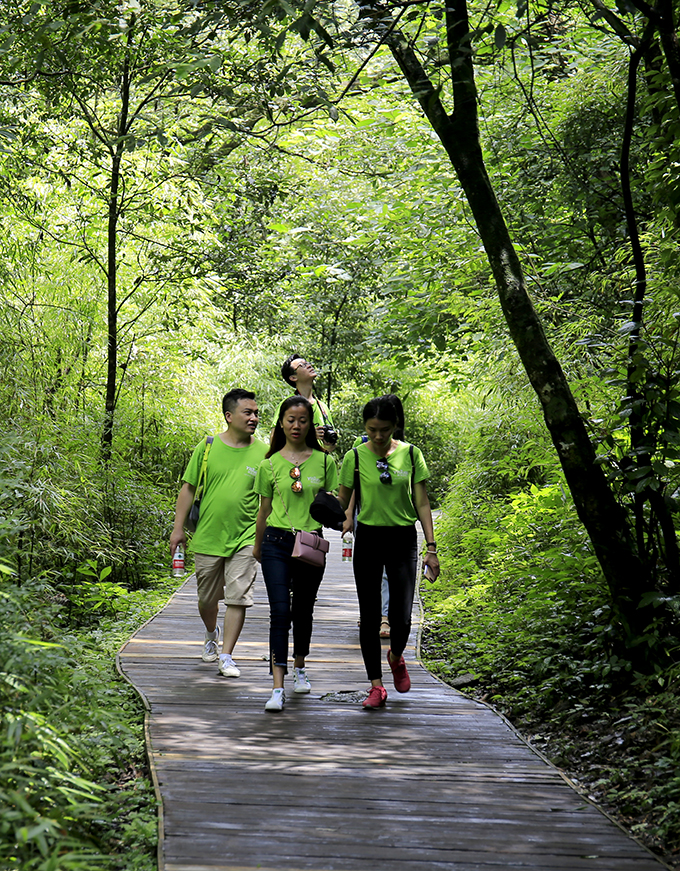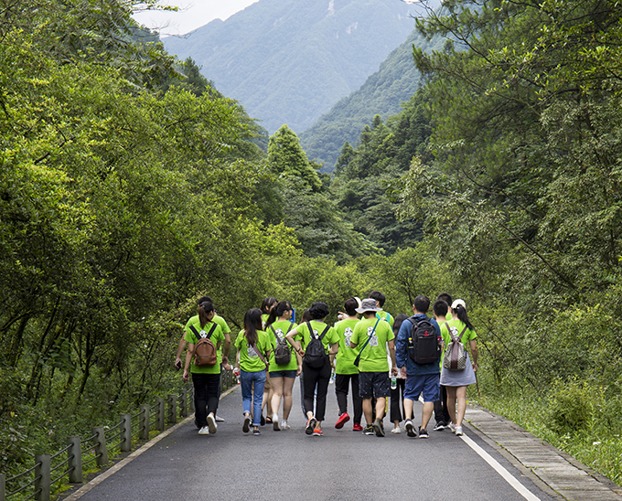 柏油路上,一群身着绿色T恤衫的小伙伴钟情于山水间,三人成众,五人成群。品花、赏鱼、观瀑……瞠目于风光绮丽,结舌于鬼斧神工,扩张肺叶吐陈纳新。